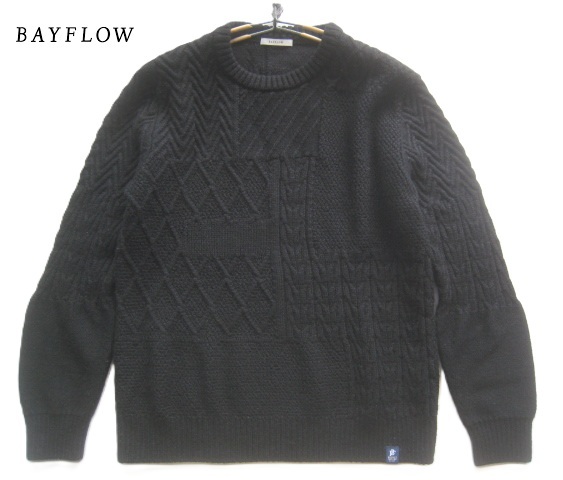 > 美品!!ベイフロー BAYFLOW*ロゴタグ付き クルーネック ケーブル編み 総織り柄ウールニットセーター 3 実寸M 紺 ネイビー 海上がりに着たい