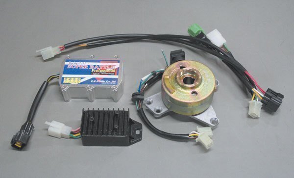 | 商品内容 | ■軽量アウターローターを採用し、Pick Upの向上を実現。 ■デジタルC.D.I.を採用、CPU交換によるプログラマブルシステムを採用。 ■低回転でも安定した点火を実現し、アイドリングを確保。 ※Fi車は使用不可です。 |