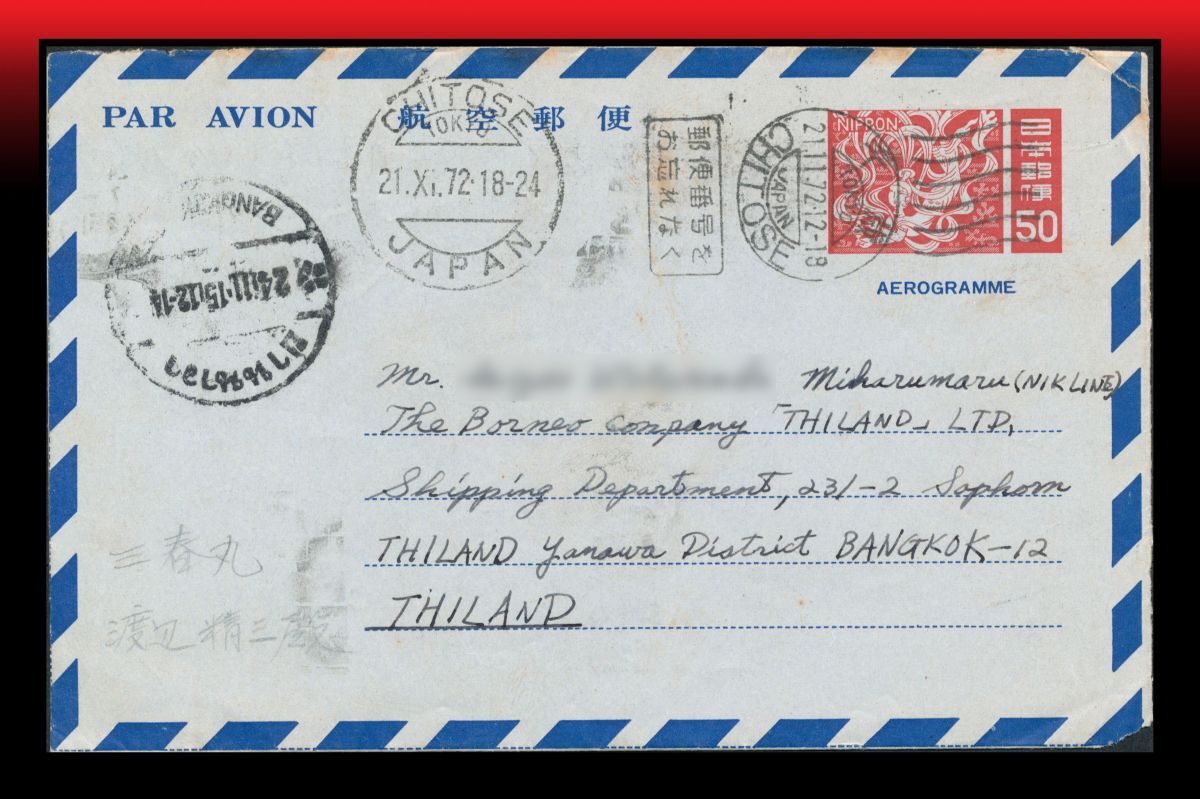- Z86 飛天50円郵番入航空書簡/タイ宛 和欧文機械印:千歳/21.11.72・12-18+同局欧文三日月印 着印画像有り エンタイア