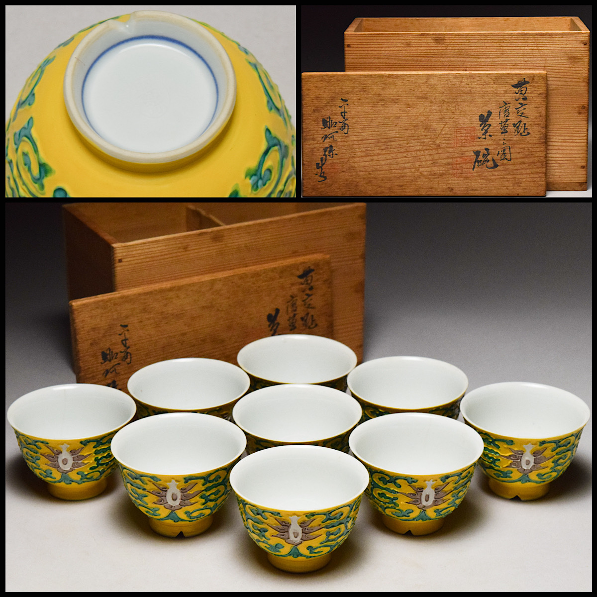 - 【八八八】平安 高野昭阿彌 黄交趾 唐草之図 茶碗 9客 ◆共箱 煎茶道具 煎茶碗 昭阿弥 【v-071】
