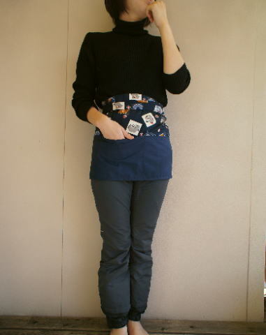 - 着物素材使用【長めサイズ】1400円!干支文に紺ポケット付きカフェエプロン