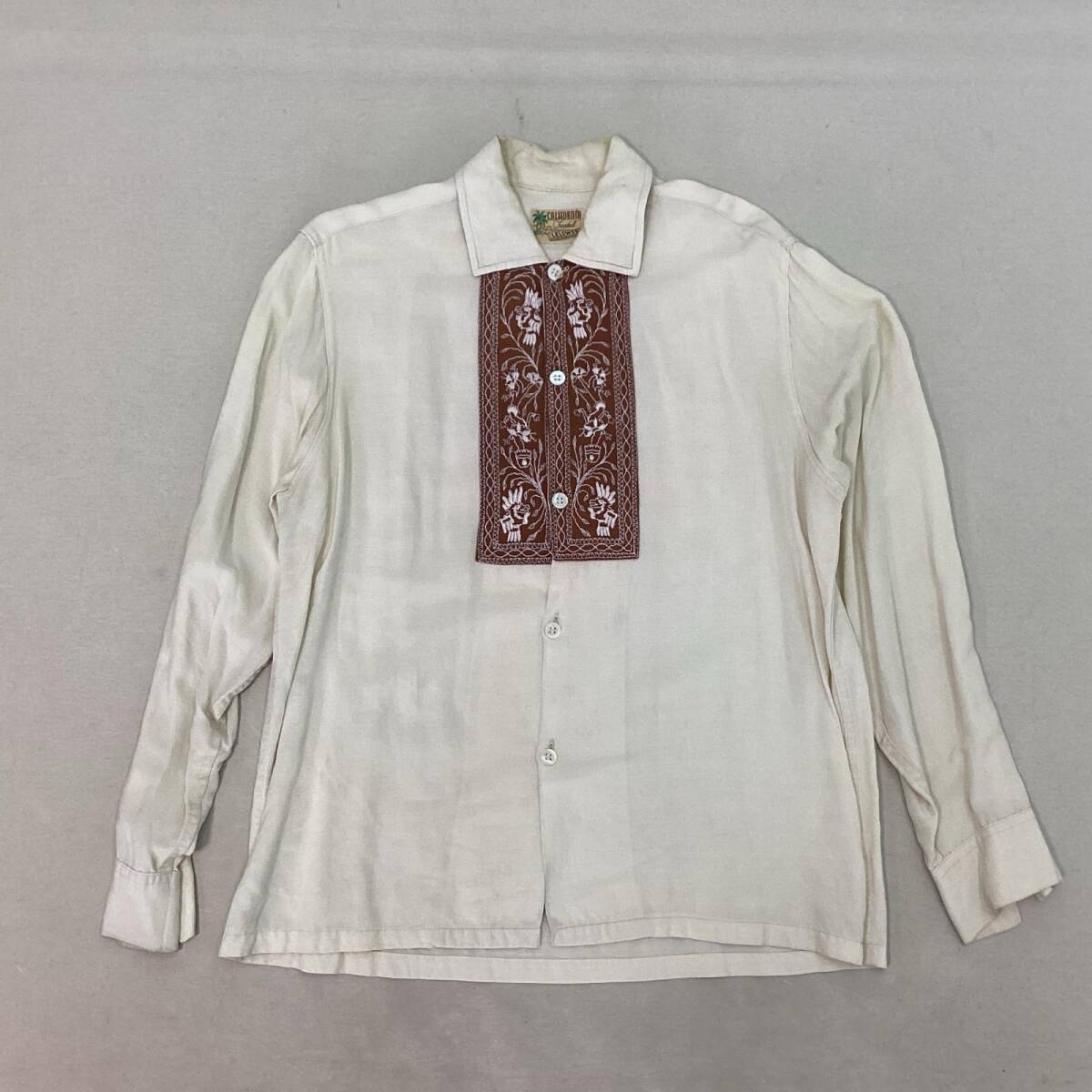 > ■ [送料198円]〜70’s LELEWER STORES FOR MEN SINCE 19865 レーヨンシャツ 長袖 ベージュ メンズ 襟芯有り 刺繍 サイズ不明 0.24kg