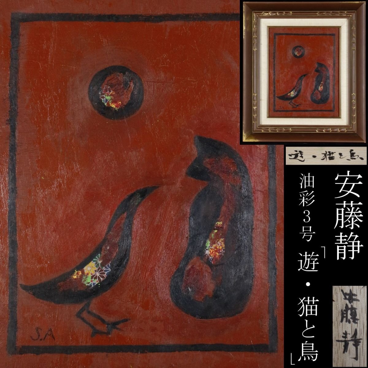 【LIG】真作保証 安藤静 「遊・猫と鳥」 油彩3号 2001年 裏書有り 額装 [.Q]25.4