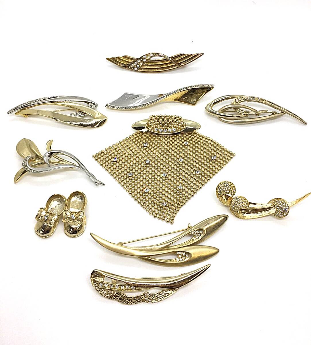 - ◆1円◆ アクセサリー ブローチ まとめ10点セット ラインストーン 大きめ ゴールド コンビ レディース パーツ一部取れ