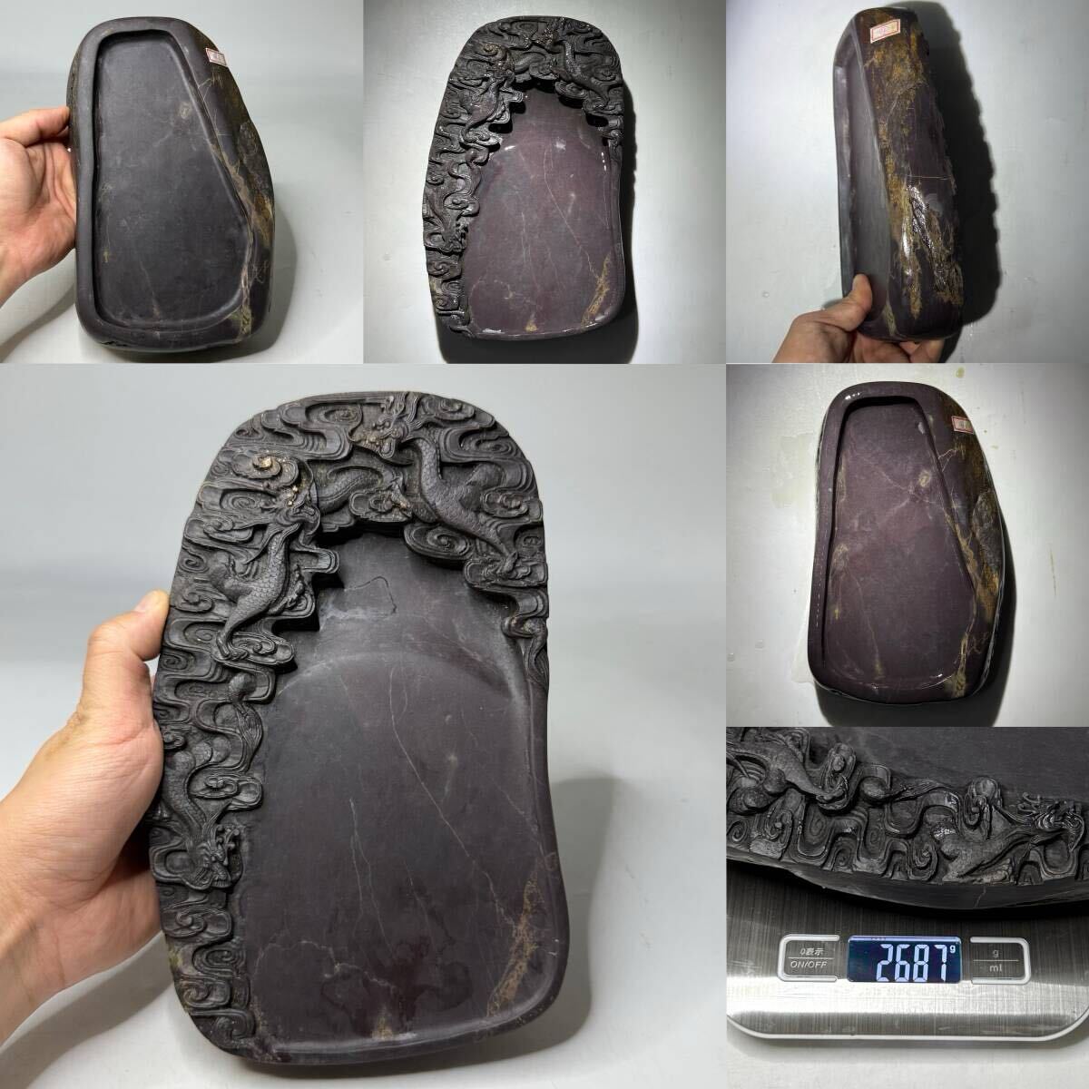 - 時代物 書道家放出品 厚重大型硯 端渓硯 老坑 水巌 雲龍文硯 共箱付き 重量約 2687 g(書道具 唐物 中国美術 文房具 煎茶道具)