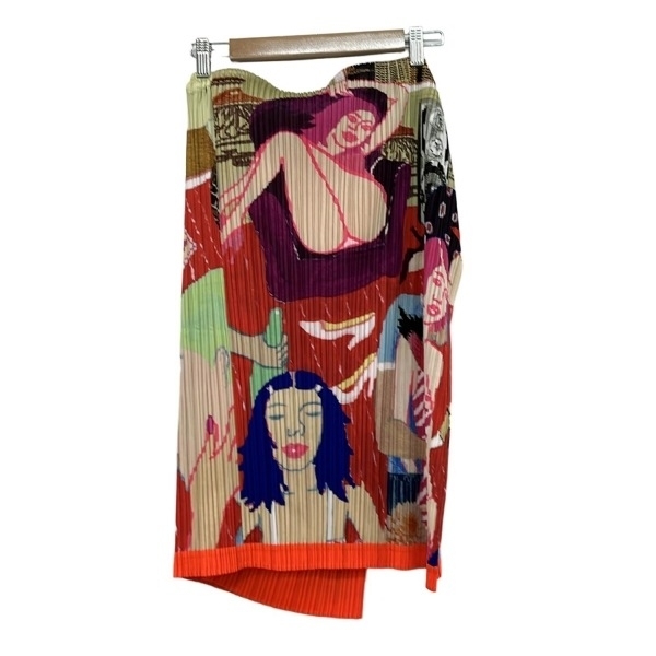 - プリーツプリーズ PLEATS PLEASE 巻きスカート サイズ3 L - レッド×ベージュ×マルチ レディース ひざ丈/プリーツ/ウエストゴム 美品