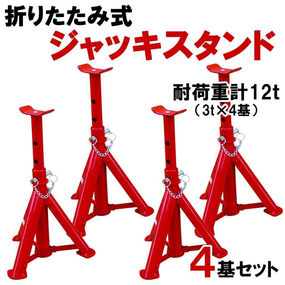 折りたたみ式 ジャッキスタンド 4基セット 商品説明 【商品名】 折りたたみ式ジャッキスタンド 3t 4基セット 【特徴】 能力12TON (4基) 3段調整式 折りたたみ機能付 【商品詳細】 ※商品画像内にて安全ロックピン付と表記されておりますが現在の製品には付属しておりません。ご了承の上ご購入お願い致します。 最高位 365mm 最低位 277mm ☆PL保険加入済み商品ですので安心! 支払い明細 送料 一部の地域を除き全国一律2000円 北海道2500円 沖縄県その他離島はお問合せください。 ■銀行振込 ■代引き可能 ■Yahoo!かんたん決済 注意事項 ※商品画像内にて安全ロックピン付と表記されておりますが現在の製品には付属しておりません。ご了承の上ご購入お願い致します。 【商品について】 輸入品の為、小傷等がある場合があります。【返品・交換】 ご注文と異なる商品が届いた場合、もしくは不良品の場合のみ送料負担で再発送いたします。 ご自身の理由による返品・交換はお受けすることができないのでご了承ください。 一度外でご使用になられた商品の交換や返品はお受けできませんのでご了承下さいませ。 連絡のない返品は受け付けておりません。ご返品の前に必ずご連絡をお願い致します。 【返品・交換】 ☆初期不良につきましては商品到着後7日以内にご連絡ください。 ご注文と異なる商品が届いた場合、もしくは不良品の場合のみ送料負担で再発送いたします。 ご自身の理由による返品・交換はお受けすることができないのでご了承ください。 一度外でご使用になられた商品の交換や返品はお受けできませんのでご了承下さいませ。 連絡のない返品は受け付けておりません。ご返品の前に必ずご連絡をお願い致します。