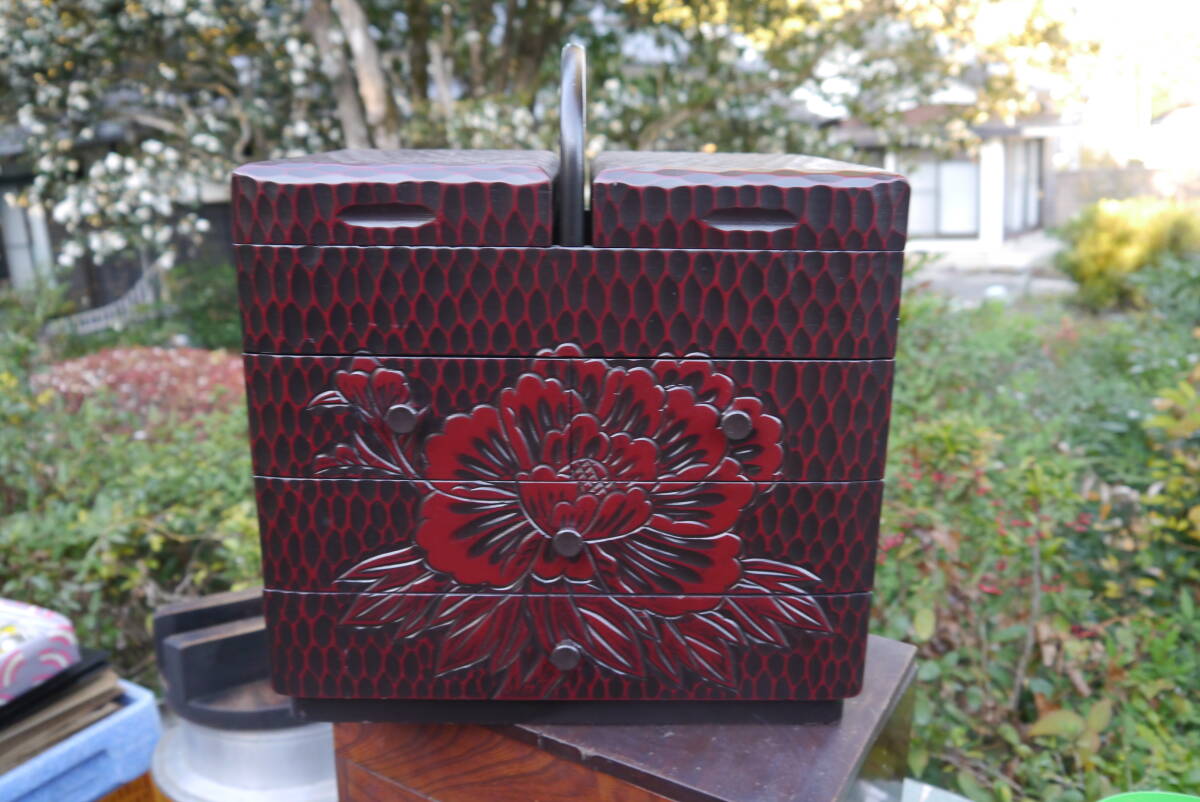 - ★【5Nov28 O】美品 鎌倉彫 牡丹の図 裁縫箱 ソーイングボックス 引き出し 抽斗 持ち手付き 針箱 道具箱 小物入れ