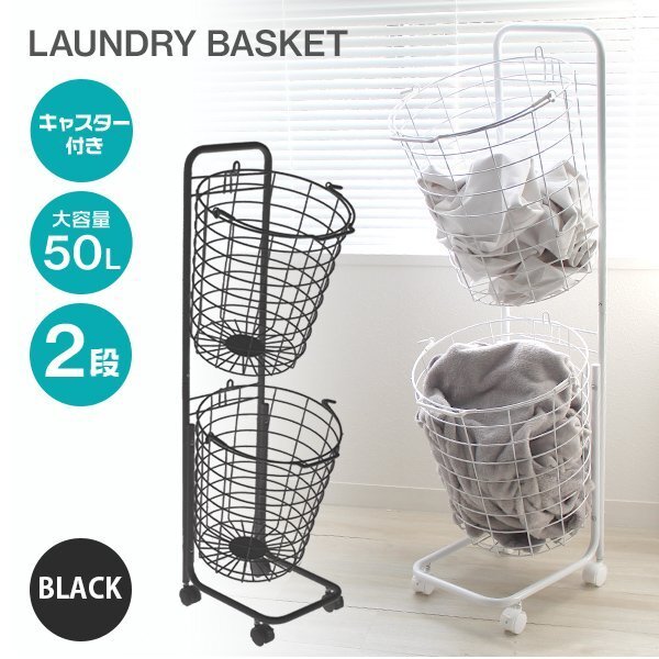 - 新品未使用 ランドリーバスケット 大容量50L 2段 キャスター付き ラック取り外し可 洗濯 脱衣 かご 北欧 おしゃれ おもちゃ箱 収納 黒