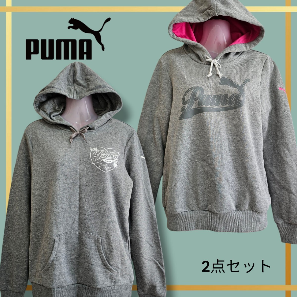 > S■ PUMA プーマ レディース フーディ 2点セット 刺繍 ロゴ プルオーバー スウェット パーカー 裏起毛 フード Lサイズ グレー トップス