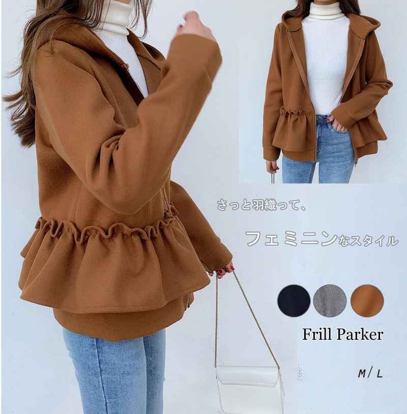 - 秋新作 トレンド レディース アウター ブルゾン フリル パーカー ウエストフリル スウェット M ブラウン