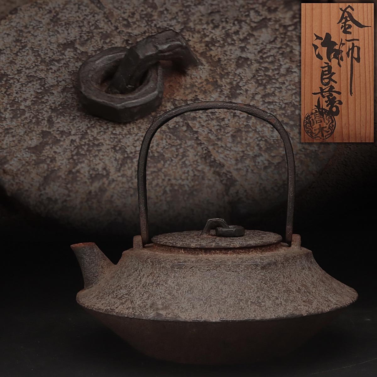 > ZN304 時代【高木 治良兵衛 造】六角環摘 亀甲 平鉄瓶 高20.5cm 水漏無 共箱附・亀甲瓶・古鉄瓶・鐡瓶・鐵壺 茶具 煎茶道具 古美術