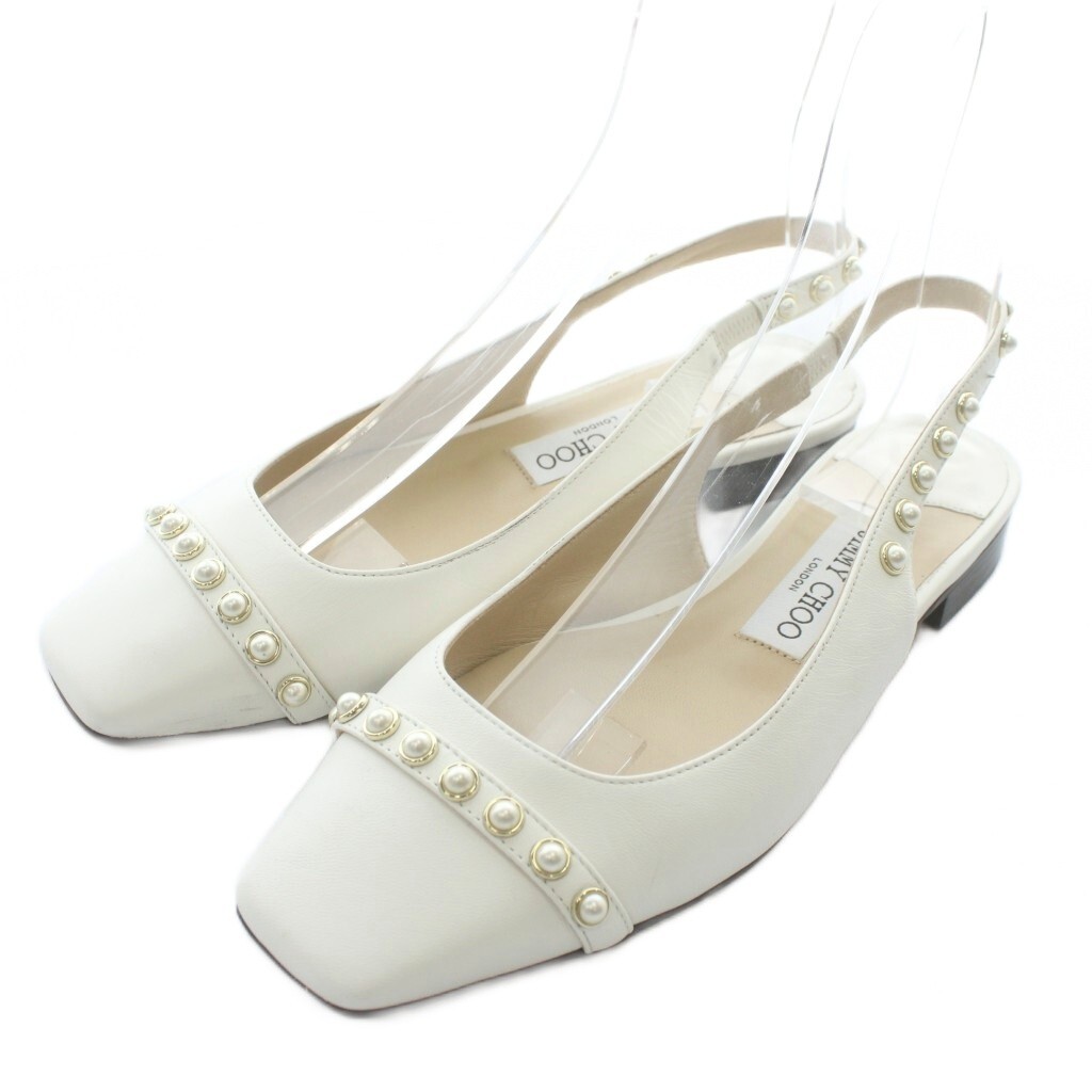 - ジミーチュウ JIMMY CHOO サンダル パンプス レザー スクエアトゥ ローヒール パール バックストラップ 37.5 24.5cm 白 ホワイト
