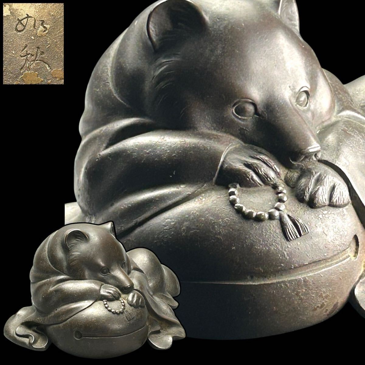 > 【翔苑】明治時代 金工師 銅製狸和尚置物 秀逸作 約1.8kg 古銅 ブロンズ 在銘 オブジェ 木魚 数珠 03.45.61