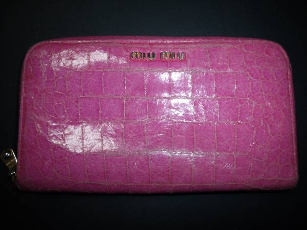 > 質店鑑定済み! $ ■ miumiu ■ ミュウミュウ ■ クロコ型 レザー素材 ■ ラウンドファスナー 長財布 ■ ピンク系 ■ 送料無料!!