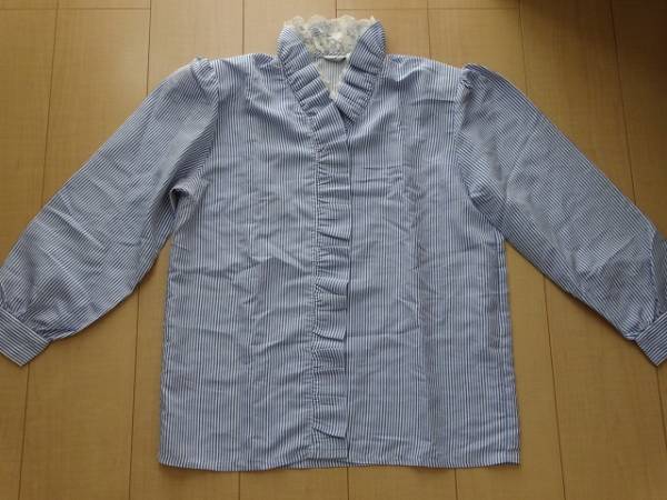 - ③used★レディース白×ブルー縦縞長袖ブラウス★肩パット付き