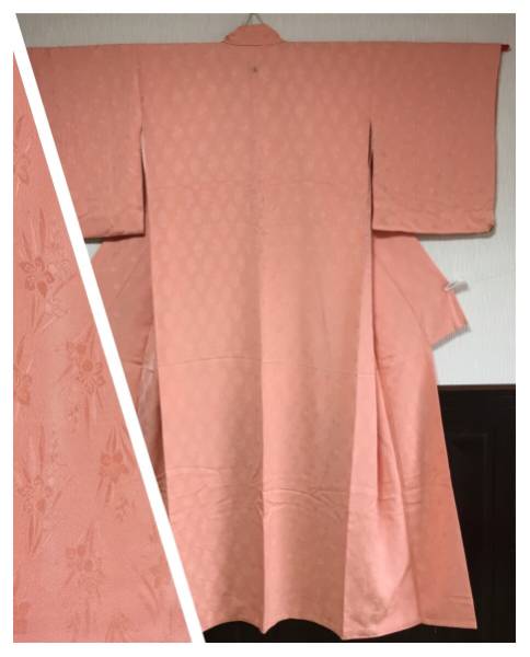 - 【色無地訪問着】正絹 袷 身丈153.5cm サーモンピンク 梅鉢家紋