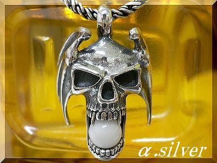- シルバー925純銀 天然石ホワイトオニキス付スカル髑髏デーモン ペンダント/alpha silver