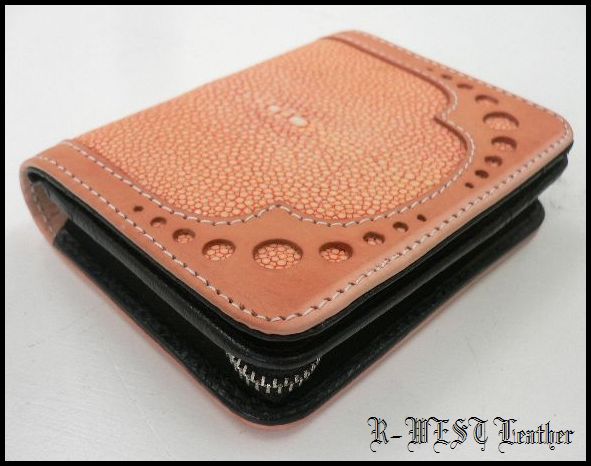 - 牛革×エイ革スティングレイ[カッティング]レザーウォレット オレンジ×ヌメ/ショートtype革財布