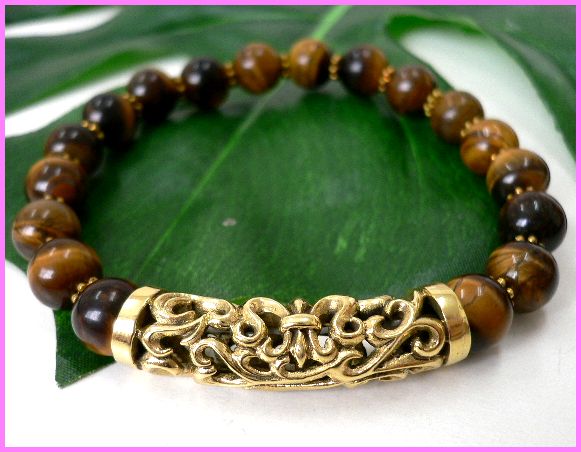 - 真鍮製Brassパーツ付 天然石8mm珠タイガーアイ数珠ブレス/ブラスアクセALL30%OFF