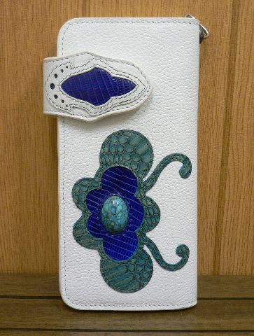 - 牛革×蛇革グリーン×リザード革ブルー 蝶ちょうちょ ストーン付レザーウォレット白/革財布ALL20%OFF