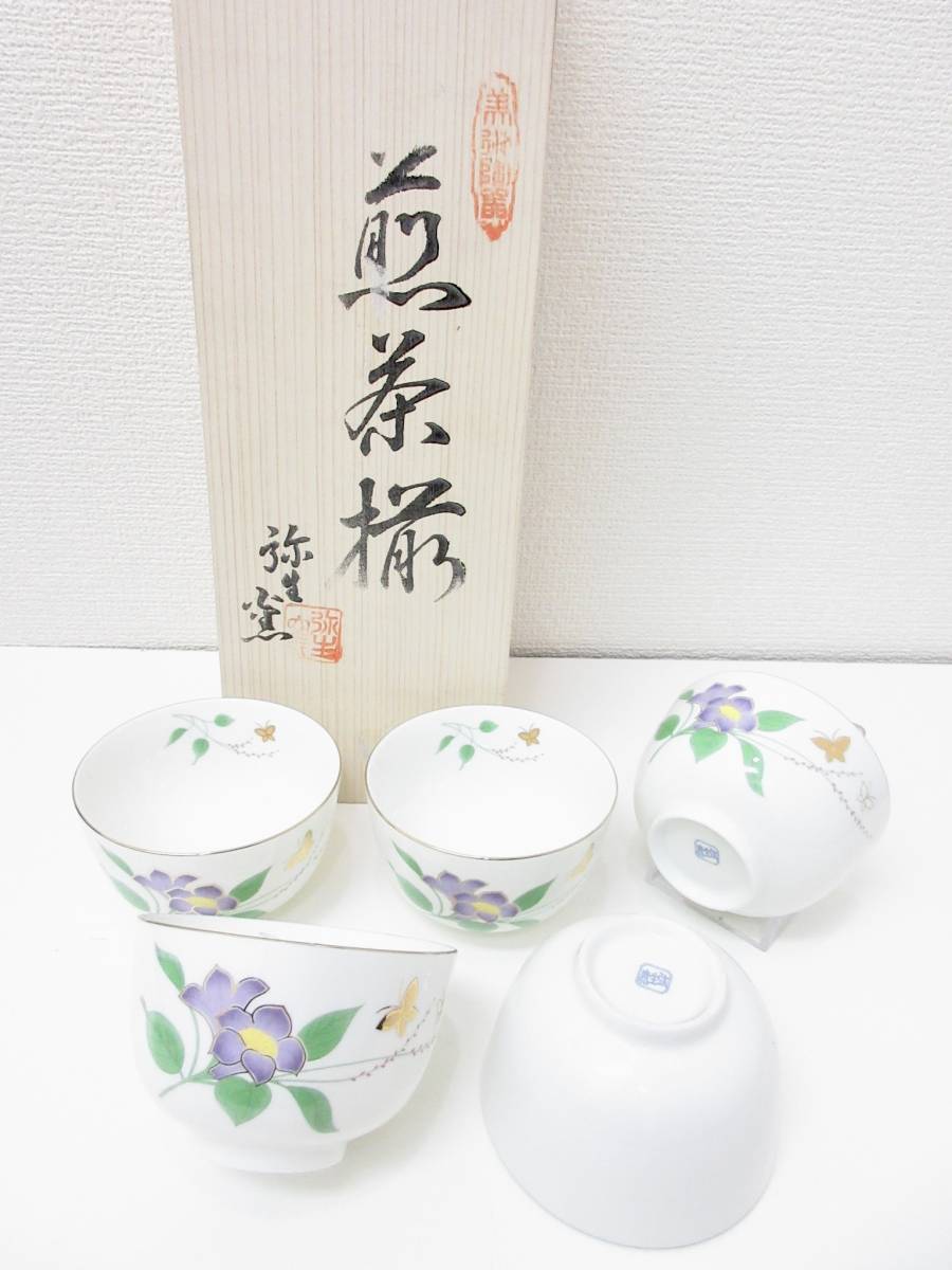 > 未使用品■弥生窯 煎茶揃 湯呑5客揃 彩磁草花 花むらさき 茶器 茶碗 木箱 管理1712 G-6
