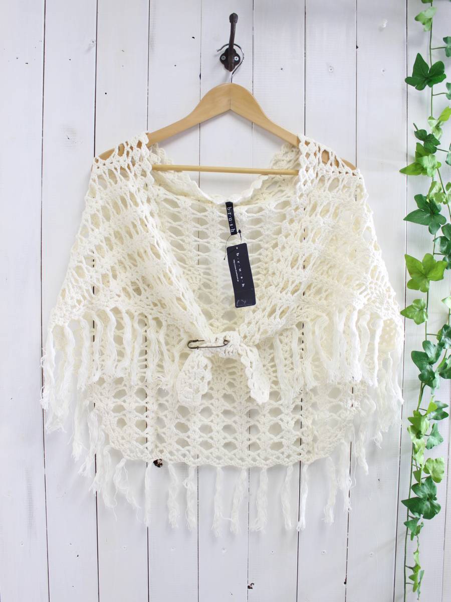 - 新品*b・r・u・s・h ブラッシュ brush*フリンジ付き 鍵編み かぎ編み ニットショール ストール (2)オフホワイト/定価6,500円