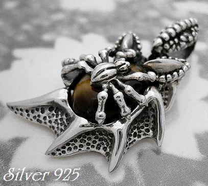 - シルバー925銀の天然石タイガーアイ付スパイダー蜘蛛ペンダント/Bu-boon silver