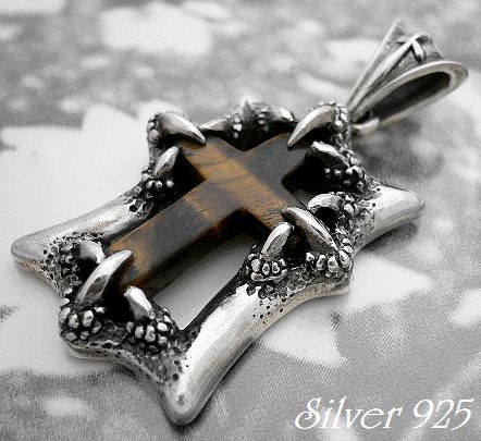 - シルバー925銀の天然石タイガーアイ十字架クロス 獣爪フレーム ペンダント/Bu-boon silver