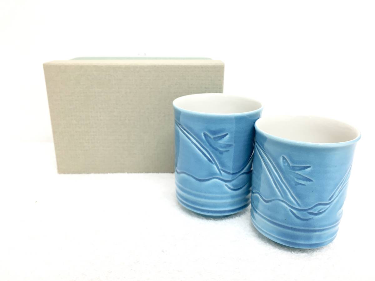 > 未使用品● 陶器 夫婦湯呑 海 青 和食器 茶器 管理 1803 X-1