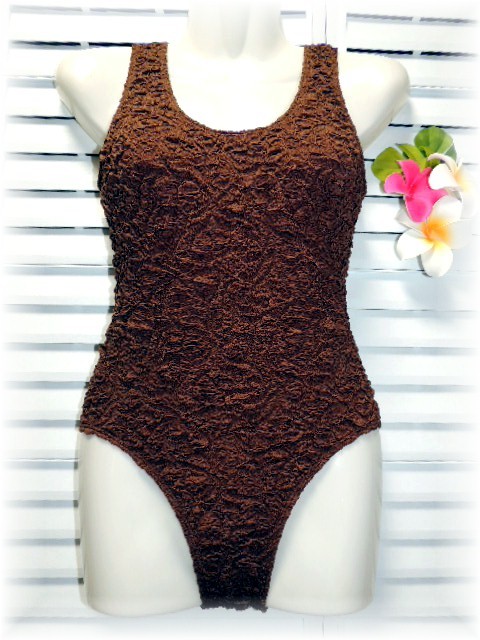 - NANNO 日本製 ワンピース水着 9号/M ブラウン×シャーリング加工 バックリボン付き