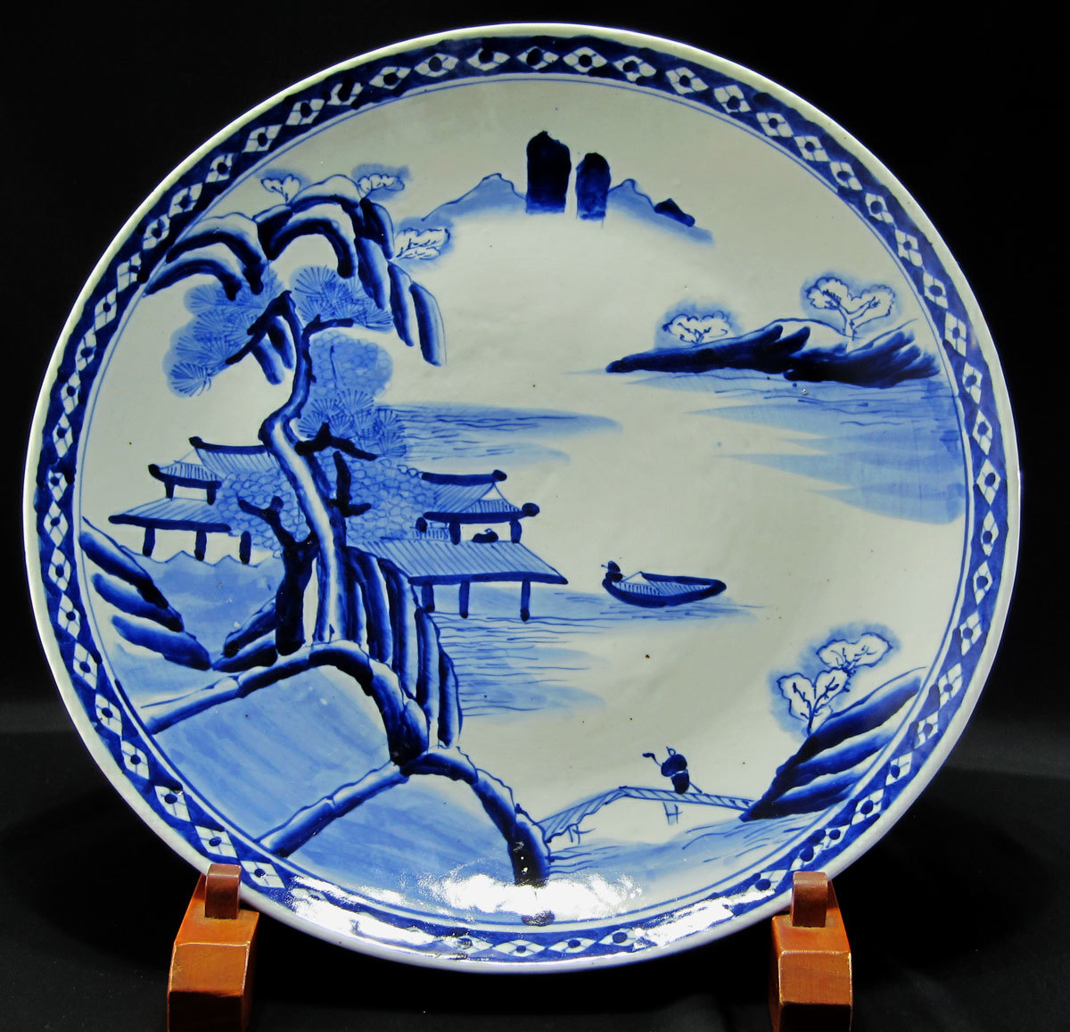 - 有田焼 染付大皿 山水図で舟 高6×40cm