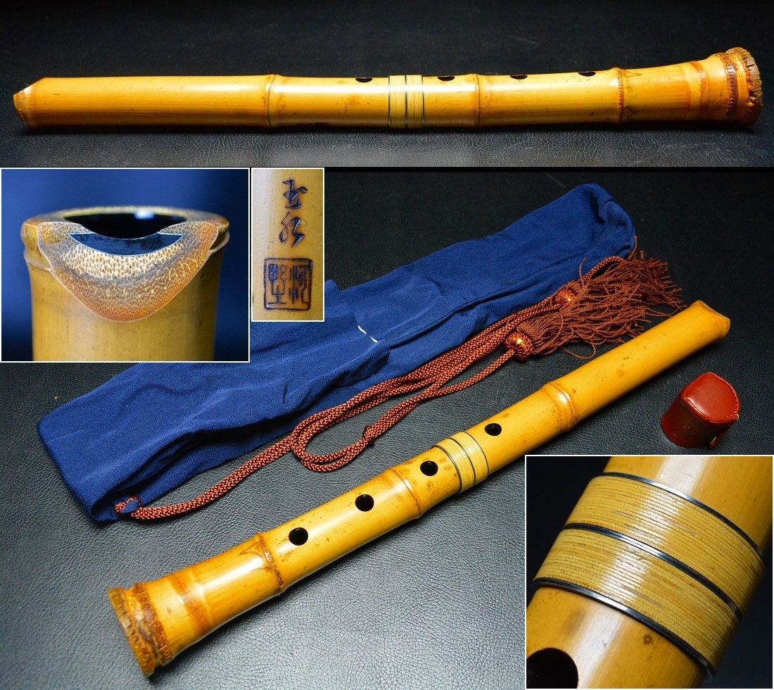 - 都山流尺八極上管 銀縁歌口【河野玉水】銀三線籐巻中継2つ折 48cm 袋.キャップ付 時代和楽器