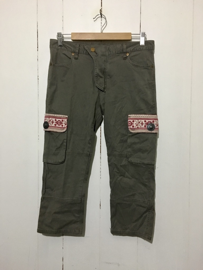 > ☆rehacer レアセル クロップドパンツ カーゴパンツ M 緑 カーキ コンチョボタン ネイティブ柄 ミリタリーパンツ アンクルパンツ