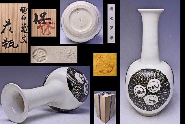 > 清水保孝 ★ 飛白亀文花瓶 ★共箱共布栞★ 人間国宝 清水卯一 子息★ 磁州窯の千点文風 ★ダブル落款 ダブルサイン 珍しい ★ 花入一輪挿し