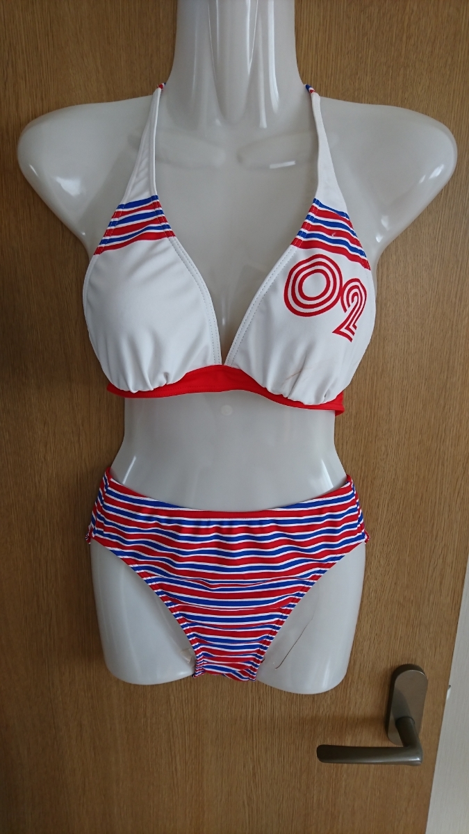 - ☆02ロゴ入り☆赤×白×青☆ボーダー柄ビキニ2点セット☆サイズ11L☆ニッキー株式会社☆