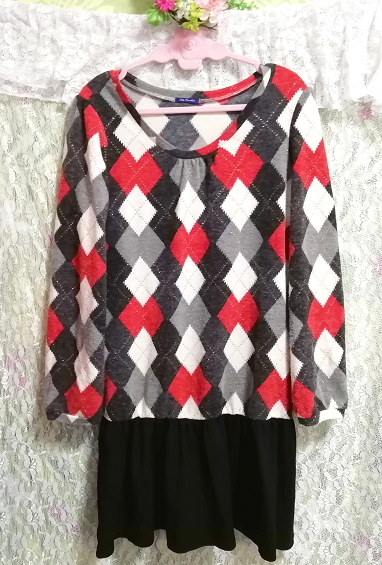 > 赤白黒灰ダイア柄ニット黒スカート長袖ネグリジェチュニックワンピース Red white ash knit negligee black skirt long sleeve tunic dress