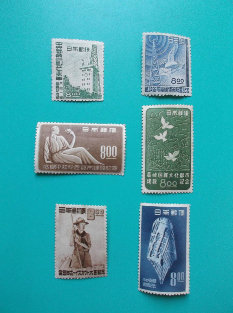 - 昭和20年代前半の記念切手銭単位12枚組 気象台 郵政電通省 広島平和 長崎文化 ボーイスカウト 新聞週間 UPU75年4種 緯度観測 放送25年