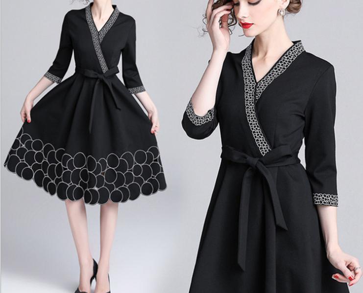 - 【新品】 M ブラック フレア ワンピース カシュクール風 ミモレ 丈 大人 エレガント 刺繍 入り ベルテッド フォーマル パーティー 黒
