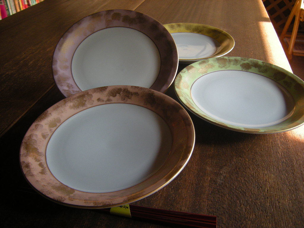 - 料亭うつわ◇現品限り【新品*廃番】金散 白磁器 色彩(不揃い)7寸(21.5㎝x3.5㎝)4枚セット まとめて *掘り出し物*廃番商品*