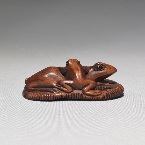 - 根付 親子蛙 柘植 木彫品 木製 彫刻品 現品お渡し na07-r-17