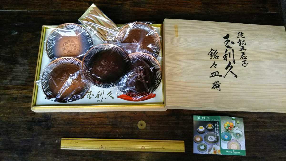 - 純銅 五君子 玉利休 銘々皿揃 5枚組 1枚サイズ【直径13㌢厚み1㎜重さ約50㌘】当時ハイカラな未使用保管品