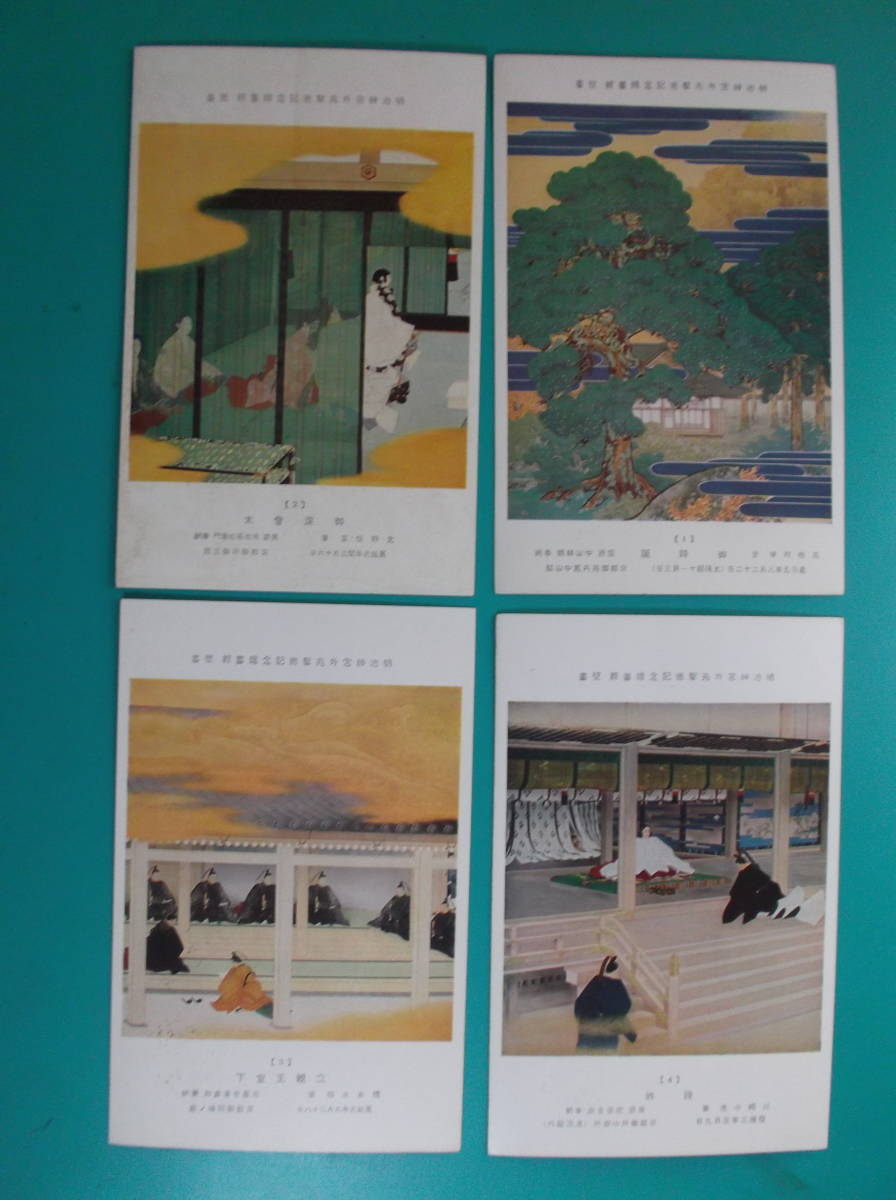 - 昔の絵葉書 日本画40枚組完袋付 明治神宮外苑壁画葉書 御降誕 御深曾木 立親王宣下 践祚 大政奉還 王政復古 伏見鳥羽戦 他 昭和14.8.5押印