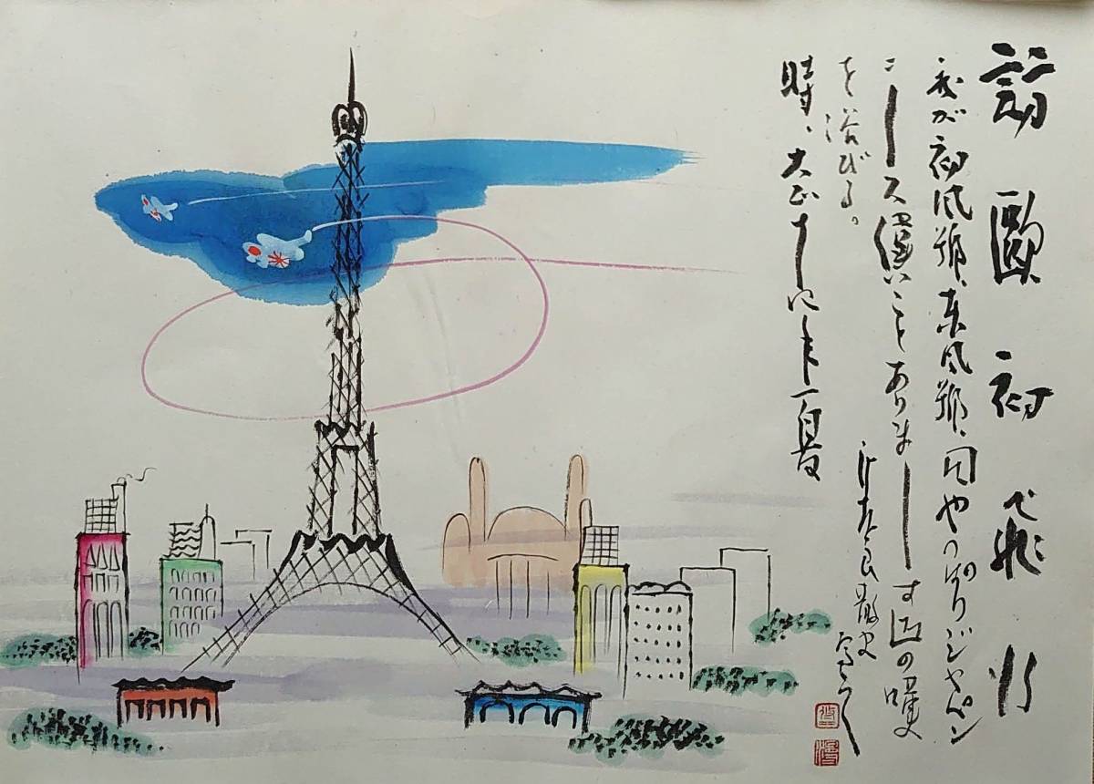 - f20072608〇肉筆漫画 色彩手書き 開国六十年史図絵 No.46 飛行機時代 大正14年 エッフェル塔 田中比佐良 昭和2年中央美術協会〇和本古書