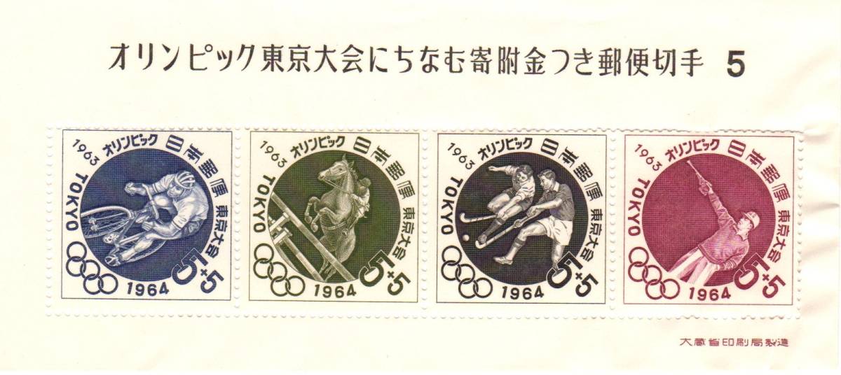 > 昭和39年1964「オリンピック東京大会募金第5次/小型シート」5円(寄付金5円)切手4枚・未使用【送料無料】「熊五郎の切手」00800027