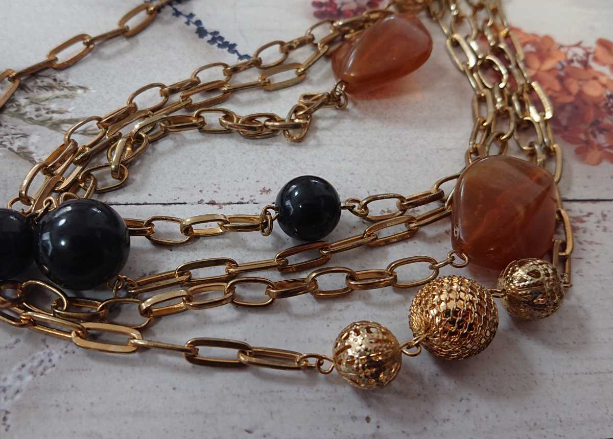 - □エレガント&シック□ブラック×飴色×透かし彫りゴールドカラ―ビーズの2連ネックレス□ゴールドカラ―チェーン□