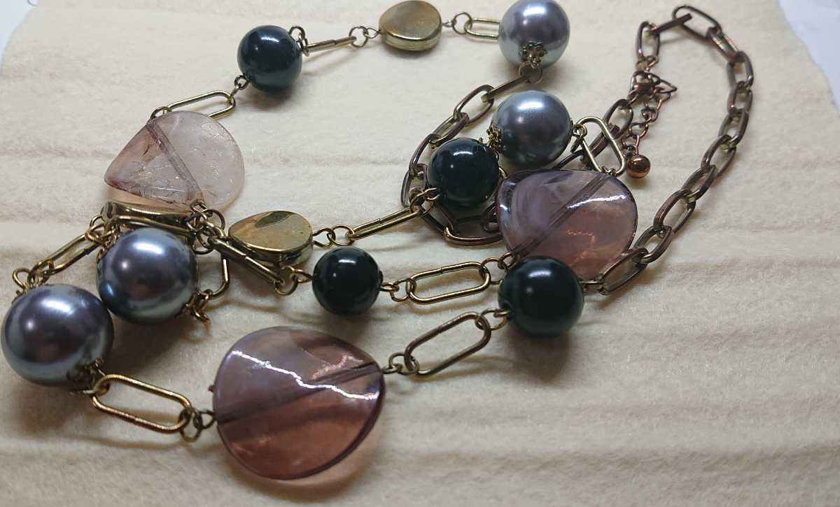 - □シックな印象□スモーキー&メタリックカラー□パールカラービーズMIXのゴールドチェーンネックレス□