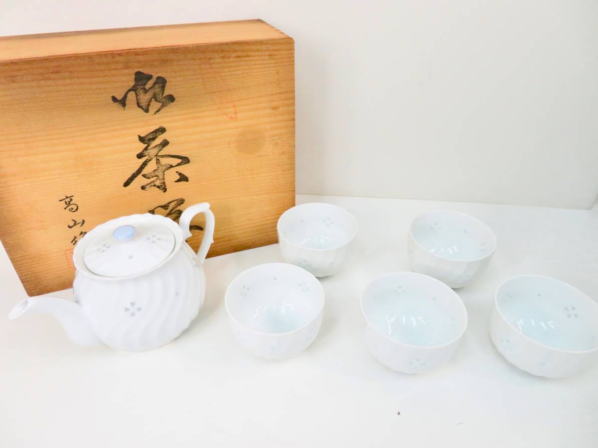 - 未使用品◆有田焼 茶器 高山作 急須 湯呑 6客セット 同柄セット ほたる彫 木箱付 茶こし付 白 小花柄 伝統 工芸品 陶磁 磁器 管理2012 K-3