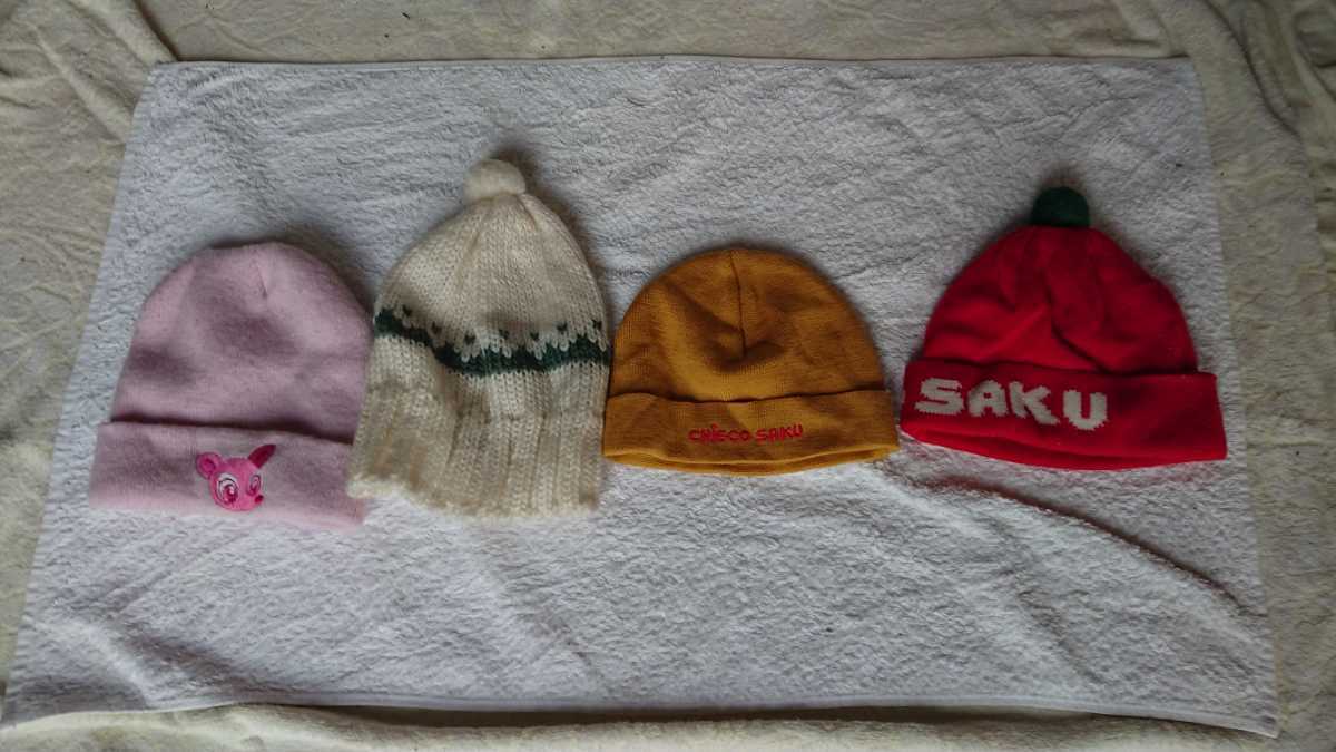 - ミキハウスの毛糸の帽子、子供用5歳未満、バンビの図柄と白に緑の柄の帽子は、ブランド無し。ミキハウスは、ちえこさくのマークあり。