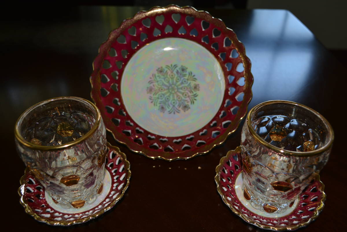 - 昭和レトロ ガラスコップ タンブラーグラス ソーサー付き 2個セット + 菓子皿1枚 ブランド不詳 美品!